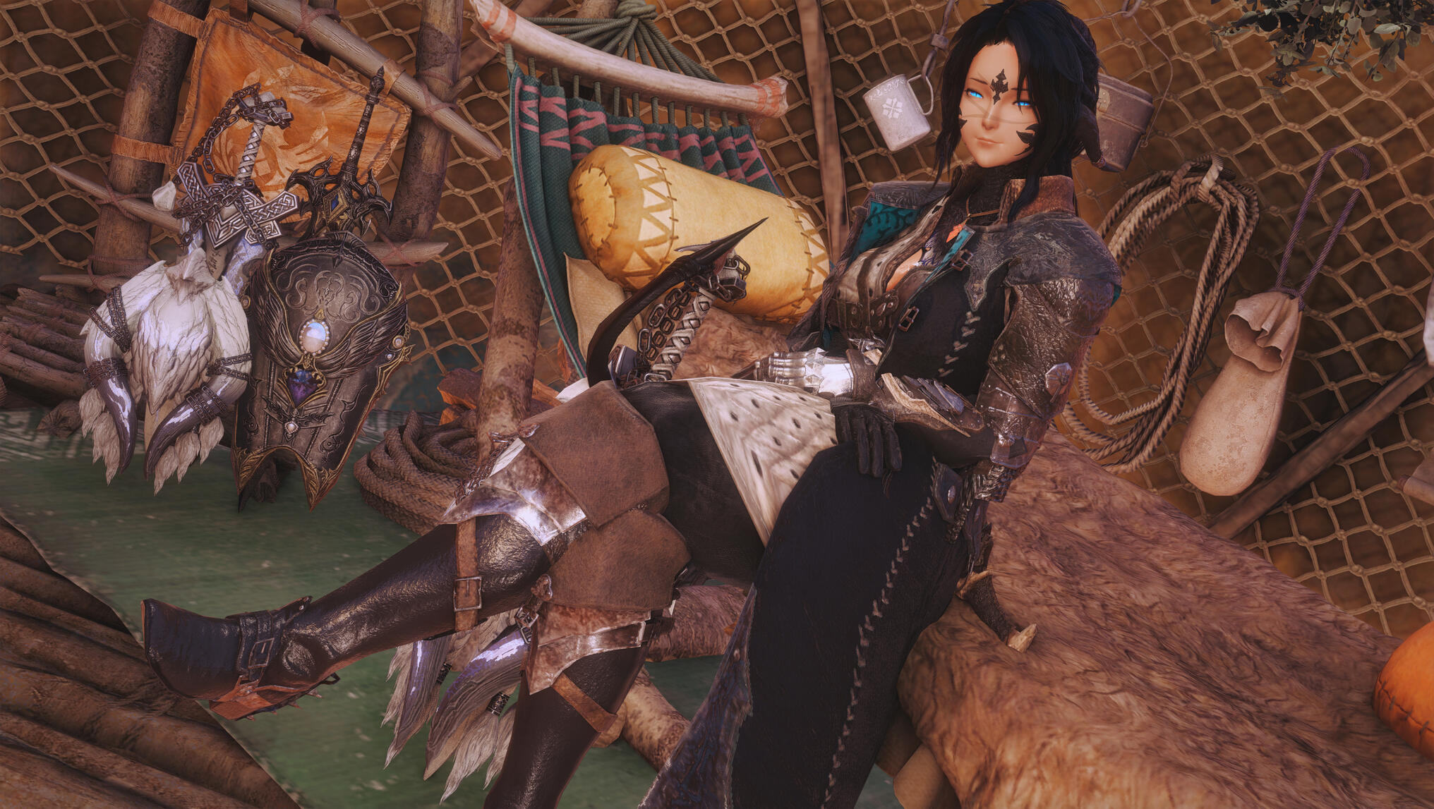 Blue, ever the steady mentor, decided it was time for Aldra to rest from battle. She quietly took Aldra’s swords and shields, believing her student had trained enough and should now focus on her pregnancy, letting her friends bear the weight she once carried. At her campsite, preparing for her next hunt, Blue stored the weapons safely—promising to return them when Aldra was ready to fight again.When Aldra returned to her room in Tuliyollal, she found a letter waiting on the table. Sitting on the couch, she opened it and read Blue’s familiar handwriting:"To my dear student and cherished friend, Aldra,