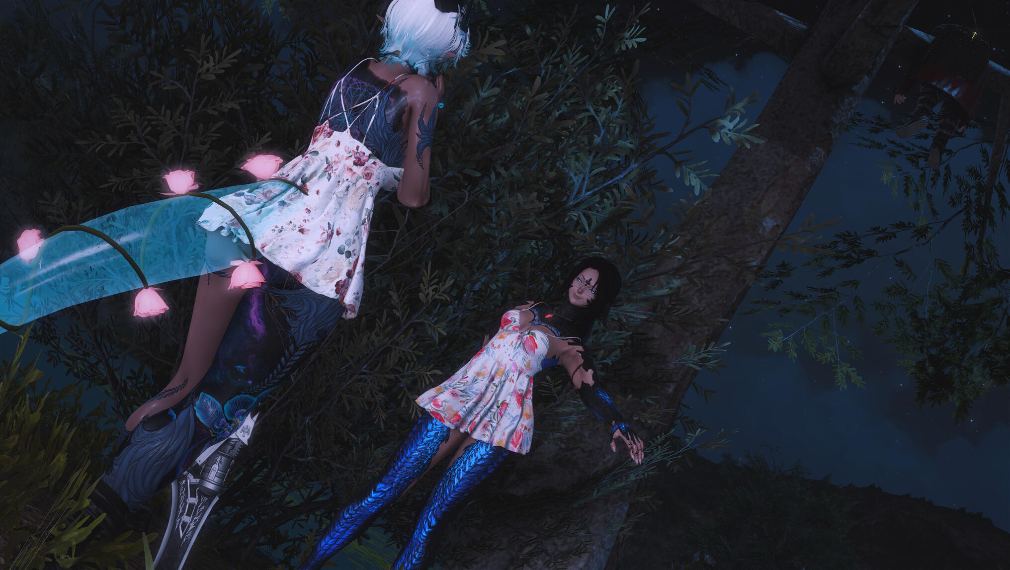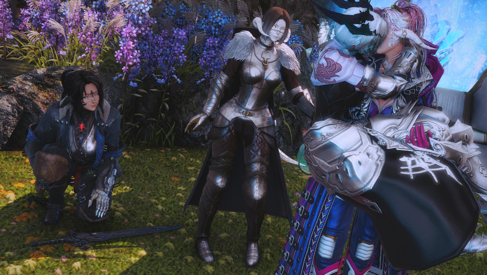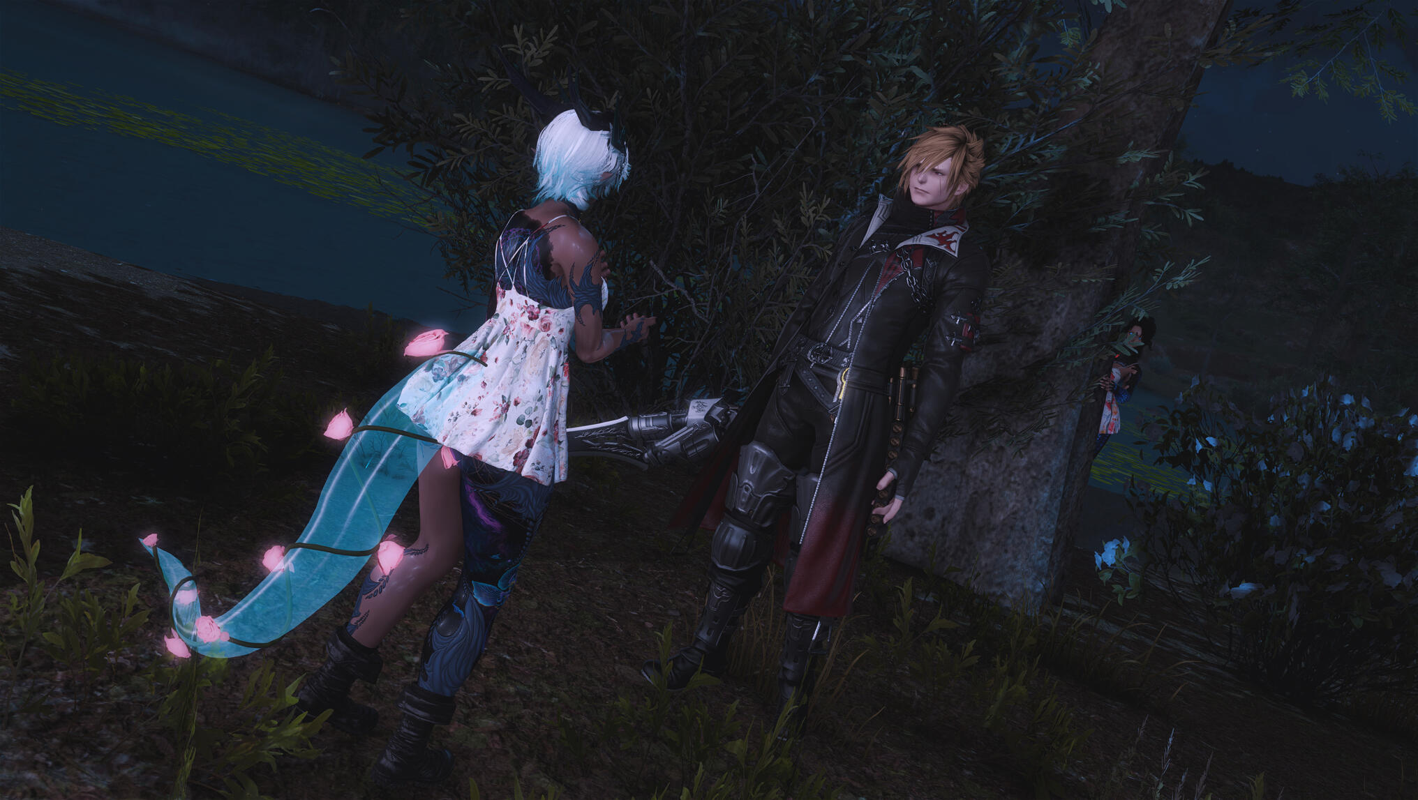 Moonlight spilled through the forest canopy, weaving silver threads across the mossy ground as Aldra followed the narrow trail to the clearing where Kiryu waited. The night air was still, heavy with the scent of pine and distant rain, the quiet broken only by the soft murmur of the river nearby.She found him standing near the glade’s edge, the faint glow of a lantern at his feet illuminating a small, wrapped parcel and a familiar, reassuring smile.“I wasn’t sure you’d come,” he said, his voice low but warm.Aldra returned his smile, her hand brushing the swell of her belly—a subtle reminder of why she moved more carefully these days. Kiryu had written her only a few nights before, his message simple and sincere: a gift, a lesson, and a wish to help her maintain her edge as a Gunbreaker, to strengthen the foundations of her paladin training even as she approached her third month.He lifted the parcel, revealing a beautifully crafted modification to her gunblade—sleeker, balanced, forged with thought and precision. His eyes carried no challenge, only concern.“You’ve always been stronger than most,” he said quietly, “but strength fades if left to rest too long. I thought… maybe we could keep your reflexes sharp, just a little.”Aldra’s expression softened, touched by his intent but resolute in her response. She reached out, placing her hand gently over his.“Kiryu… I made a vow,” she said softly. “Blue’s orders were clear. My duty now is to rest—to protect this life growing within me. It’s not forever, just for now.”Unseen in the shadowed boughs beyond the clearing, Blue watched. Her sharp eyes followed every movement, her patience a taut string ready to snap. She trusted Aldra’s resolve, but Kiryu’s persistence—and his worry—tested the calm she fought to maintain.