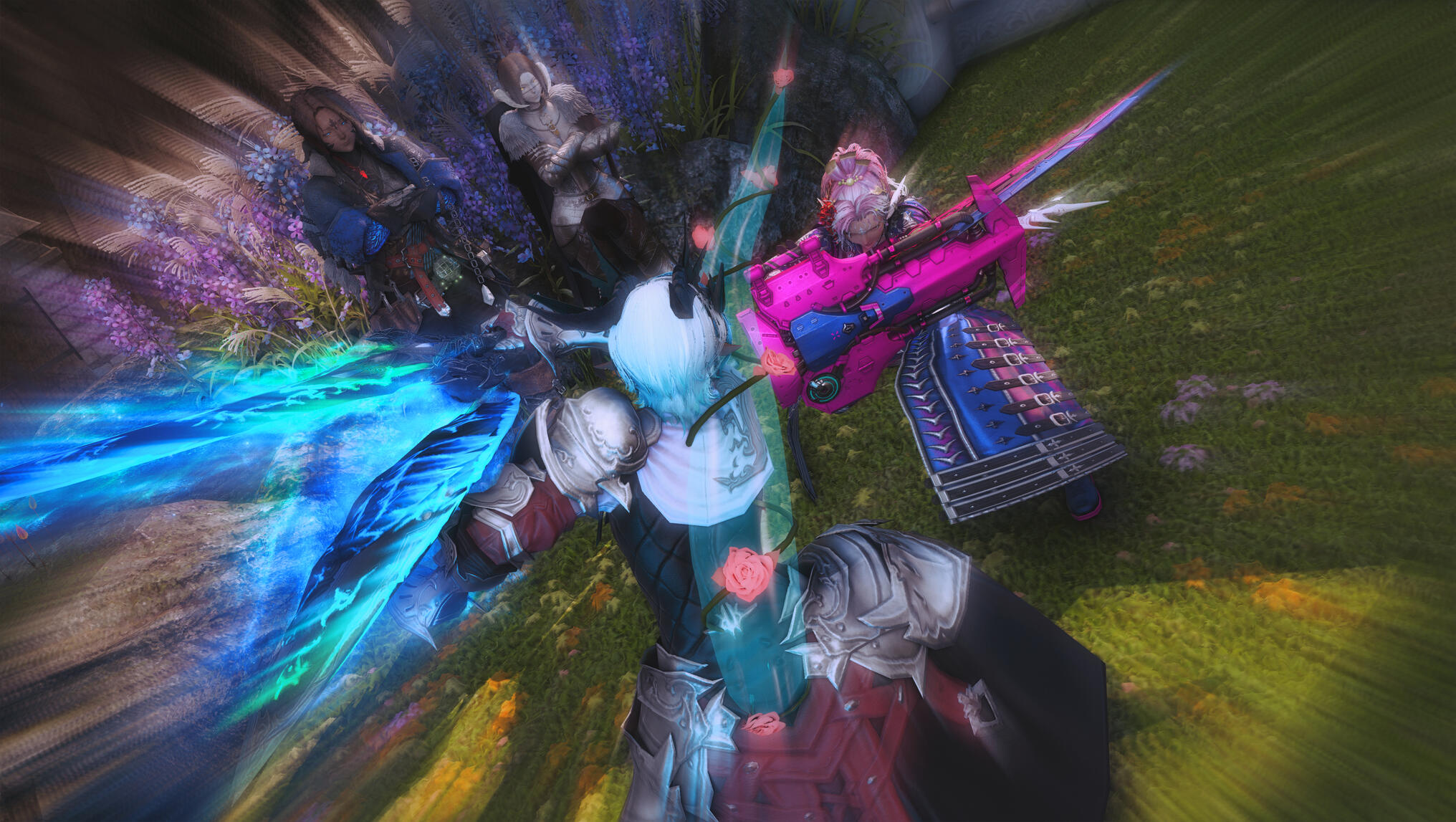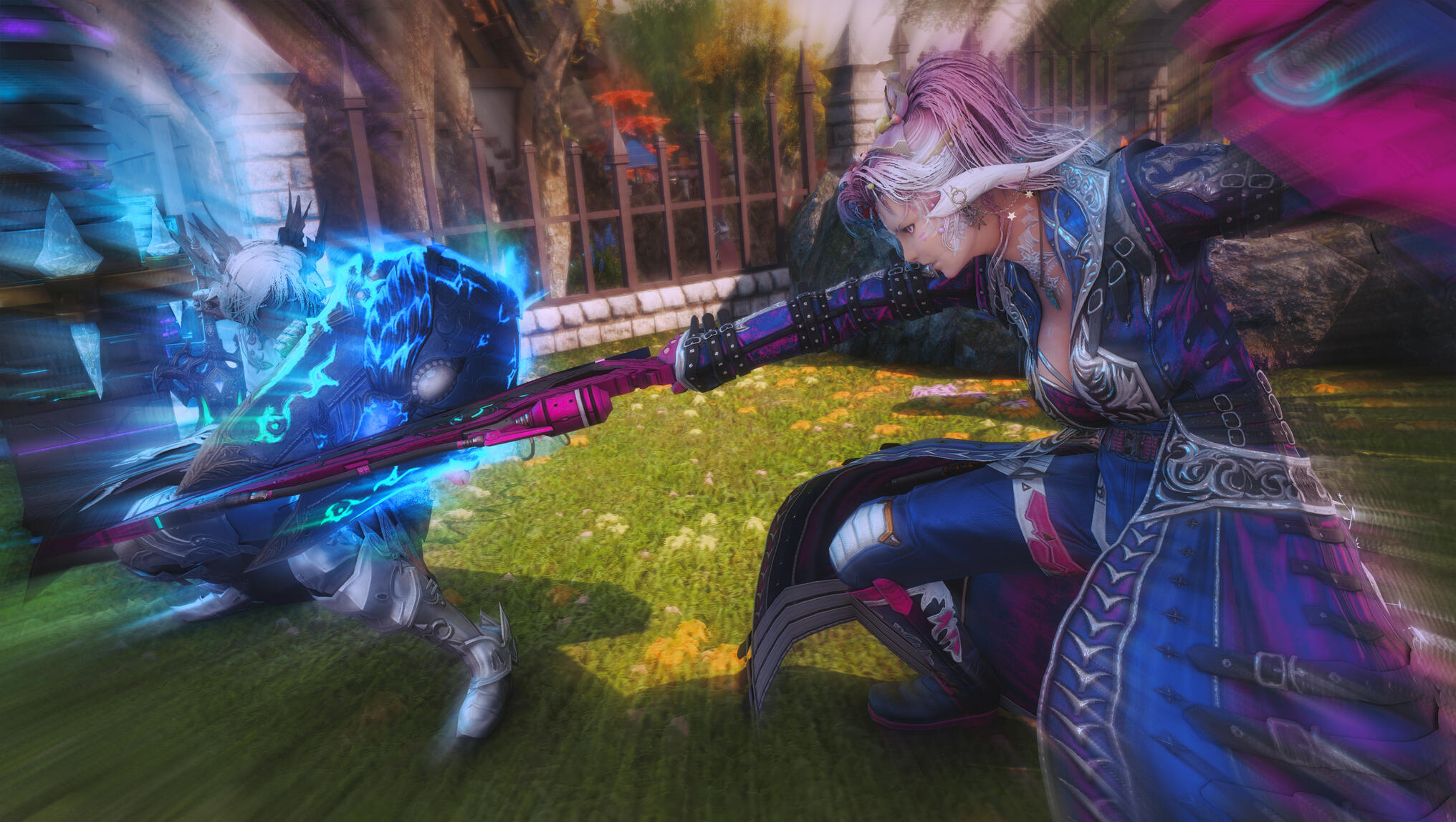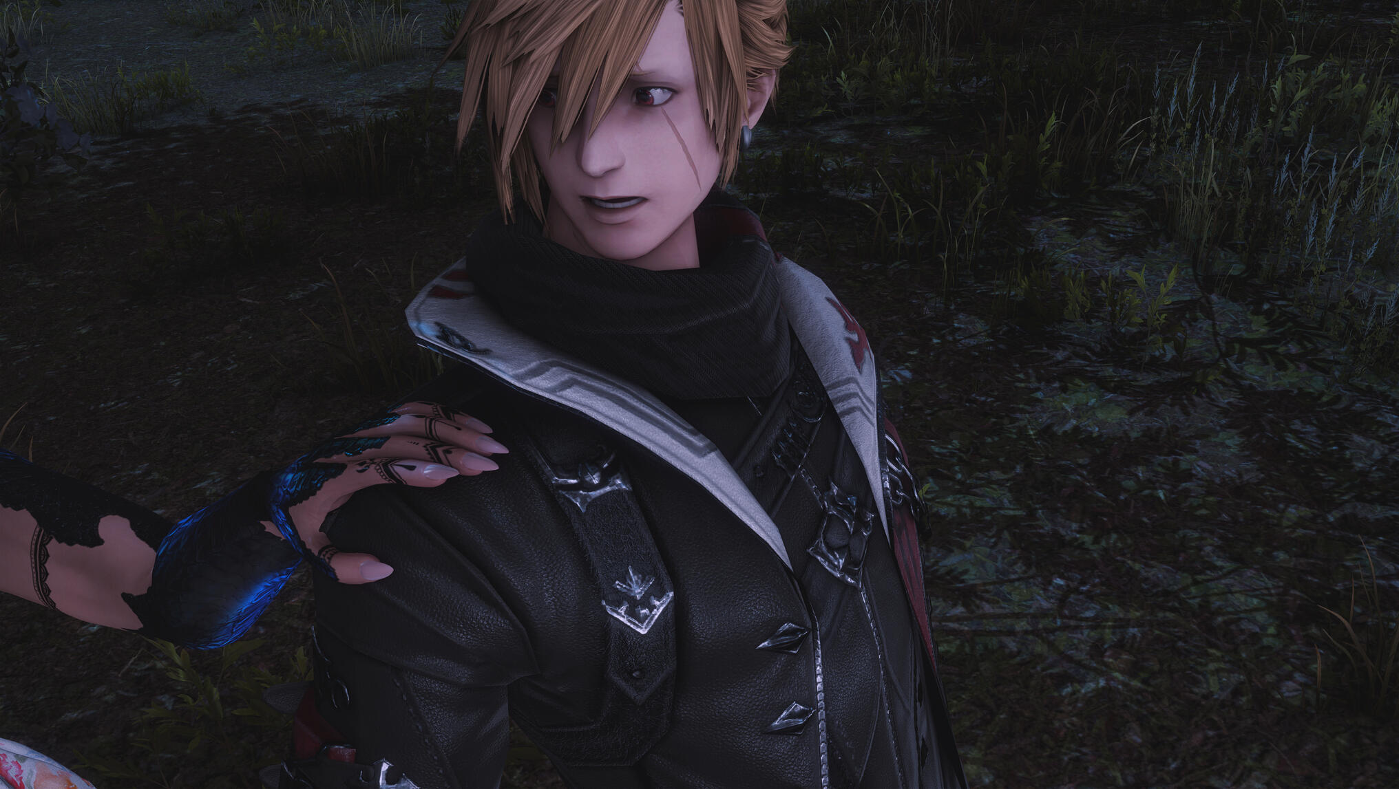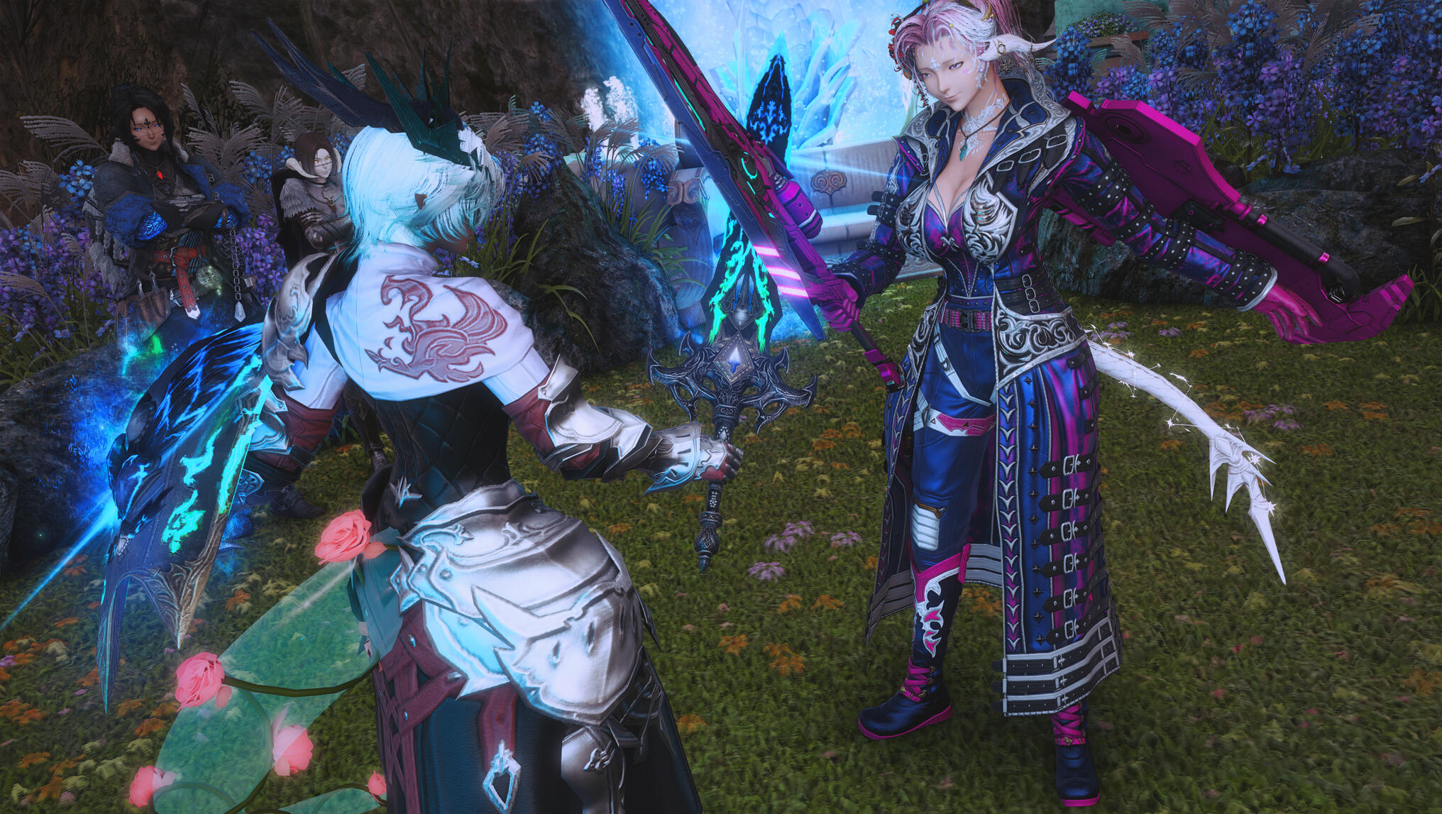 Moonlight spilled through the forest canopy, weaving silver threads across the mossy ground as Aldra followed the narrow trail to the clearing where Kiryu waited. The night air was still, heavy with the scent of pine and distant rain, the quiet broken only by the soft murmur of the river nearby.She found him standing near the glade’s edge, the faint glow of a lantern at his feet illuminating a small, wrapped parcel and a familiar, reassuring smile.“I wasn’t sure you’d come,” he said, his voice low but warm.Aldra returned his smile, her hand brushing the swell of her belly—a subtle reminder of why she moved more carefully these days. Kiryu had written her only a few nights before, his message simple and sincere: a gift, a lesson, and a wish to help her maintain her edge as a Gunbreaker, to strengthen the foundations of her paladin training even as she approached her third month.He lifted the parcel, revealing a beautifully crafted modification to her gunblade—sleeker, balanced, forged with thought and precision. His eyes carried no challenge, only concern.“You’ve always been stronger than most,” he said quietly, “but strength fades if left to rest too long. I thought… maybe we could keep your reflexes sharp, just a little.”Aldra’s expression softened, touched by his intent but resolute in her response. She reached out, placing her hand gently over his.“Kiryu… I made a vow,” she said softly. “Blue’s orders were clear. My duty now is to rest—to protect this life growing within me. It’s not forever, just for now.”Unseen in the shadowed boughs beyond the clearing, Blue watched. Her sharp eyes followed every movement, her patience a taut string ready to snap. She trusted Aldra’s resolve, but Kiryu’s persistence—and his worry—tested the calm she fought to maintain.