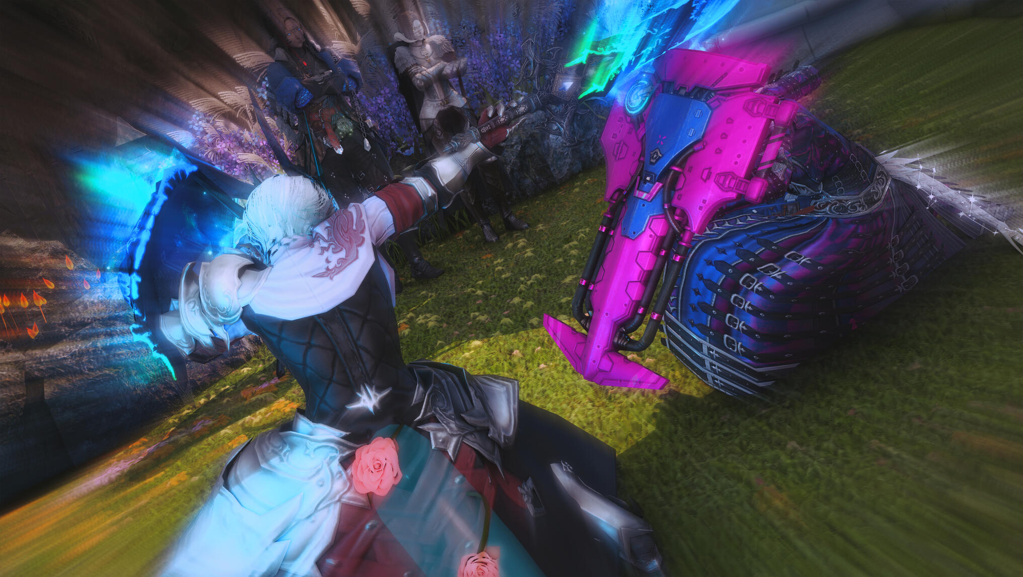 Alicia sheathed her weapon and stepped toward her wife, her expression softening. She caught Aldra before she could fall, holding her close. Pride, love, and gratitude mingled in her voice as she whispered, “You’ve come so far, my heart. You’ve done enough.” Then, with quiet tenderness, she kissed her—an embrace that spoke of shared triumph and unspoken promises.Blue approached, her tone calm but resolute. She lifted Aldra’s sword and shield from the ground, cradling them with reverence. “These will stay with me for now,” she said. “Until your strength returns—and until you’re ready to wield them again.” Kané nodded in agreement, a warm smile breaking her usual stoicism. “Rest well, little knight. You’ve earned it.”With a gentle laugh, Alicia scooped Aldra into her arms, carrying her back toward their home. Over her shoulder, she called to their friends, “Come join us for tea—and perhaps a few of Aldra's famous cookies she made for you, Blue.”As they walked inside, the laughter of friends followed them through the garden, mingling with the rustle of petals in the breeze. The day had ended not in battle, but in peace—one chapter closed, and a new journey quietly beginning.